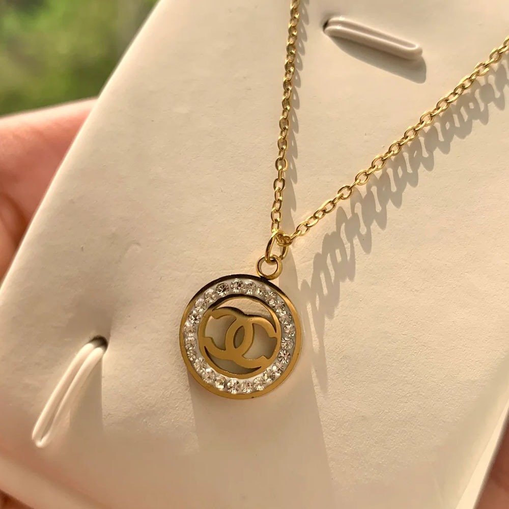This  stainless steel necklace features a circular branded pendant, beautifully crafted for a timeless look. The pendant’s outer edge is adorned with rounded, dazzling crystals, adding a touch of brilliance and elegance. The durable stainless steel chain complements the pendant perfectly, ensuring long-lasting shine and quality. Lightweight and versatile, this necklace is ideal for both casual outings and formal occasions. It makes the perfect gift for her, whether for a birthday, anniversary, or just to show your appreciation.